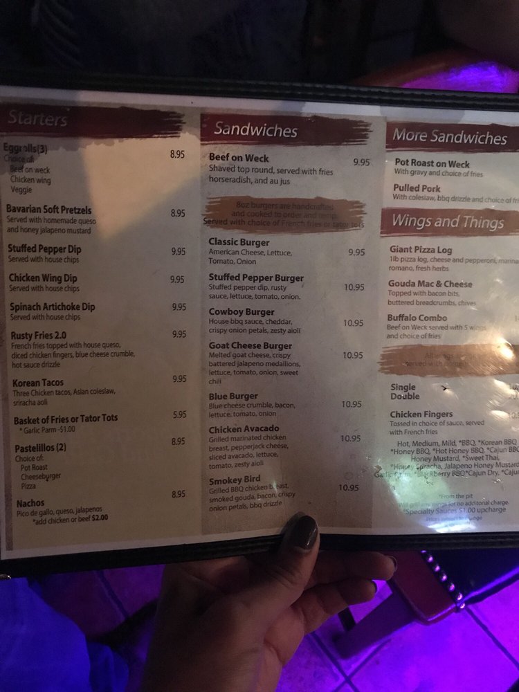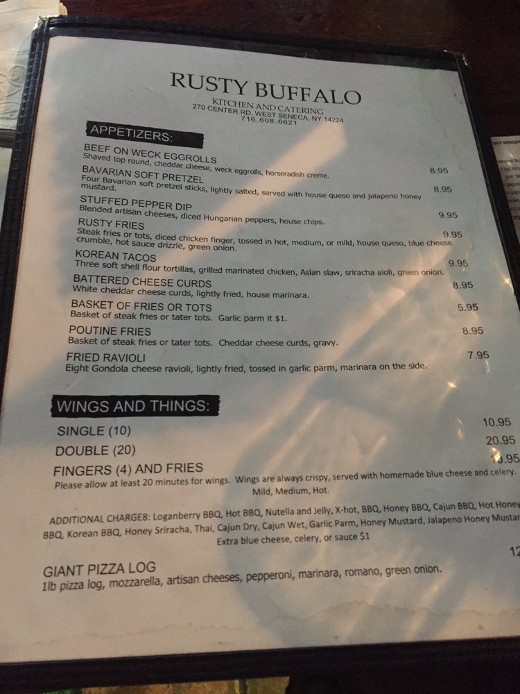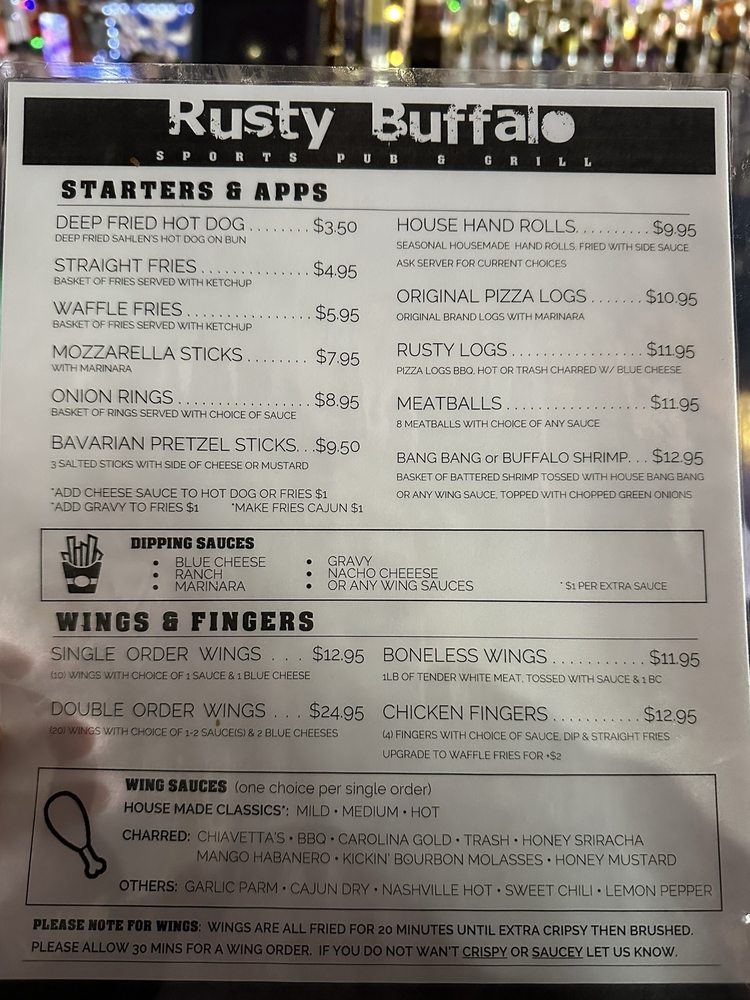Welcome to Rusty Buffalo Pub, the ultimate destination for sports enthusiasts and food lovers in West Seneca, NY. Known for its vibrant atmosphere and top-notch service, this pub specializes in mouthwatering chicken wings and hearty burgers. The extensive menu features tantalizing starters like Bavarian Soft Pretzels and unique options such as the Giant Pizza Log, ensuring there's something for everyone.